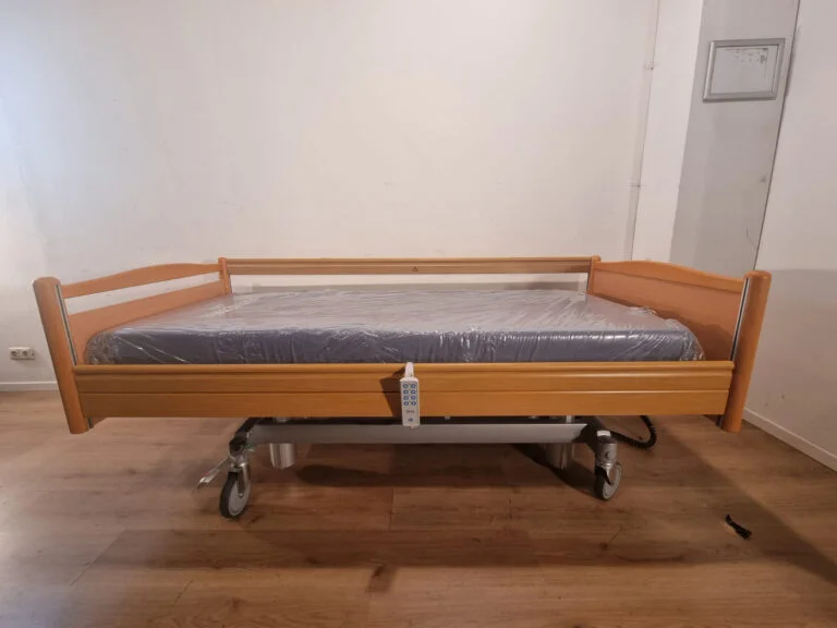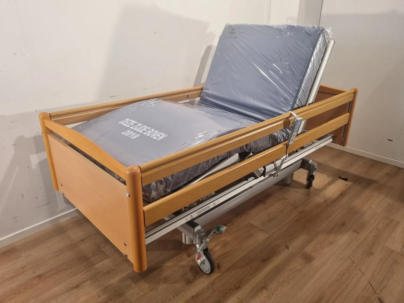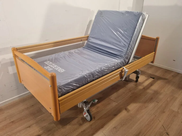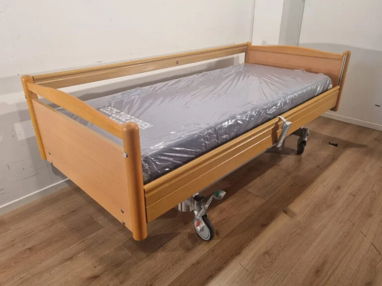Volker 3-section full option electric hospital bed #40b with wooden head and footboards, wooden side rails and grey high-low columns. These hospital beds are in excellent condition and come with a good quality medical mattress.